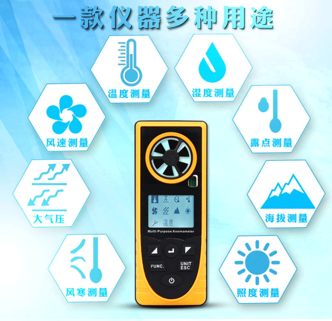 本產(chǎn)品是一款本便攜式多功能氣象儀,適用于測量溫度、濕度、風(fēng)寒、露點(diǎn)、風(fēng)速、大氣壓、海拔、照度。
