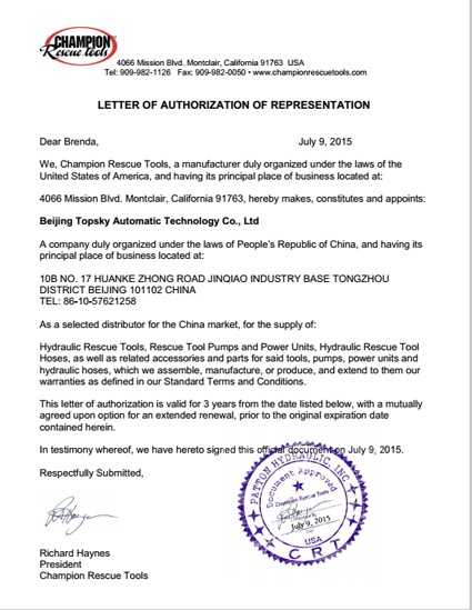 2015年7月9日,北京凌天成為美國CHAMPION公司八爪魚破拆工具組總代理