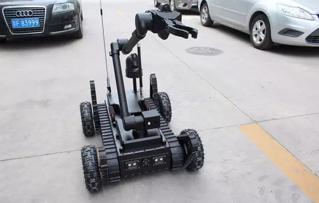 機(jī)械臂部分配備爆炸物銷毀器、瞄準(zhǔn)器,能現(xiàn)場對(duì)爆炸物進(jìn)行摧毀;