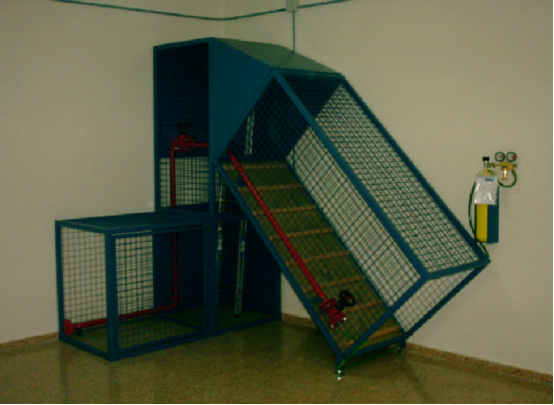 此裝備可以模擬各類尺寸偏小的坡度可變的巷道(0-45度),巷道內(nèi)行進(jìn)方式為爬行或者側(cè)行根據(jù)巷道擺放形式不同,內(nèi)部采用摩擦系數(shù)較大的塑膠鋪成,方便人員行動。外側(cè)有手扶爬梯,人員在下部進(jìn)入上部走出進(jìn)行計量,可以自動計算人員規(guī)定時間內(nèi)的行走次數(shù)。