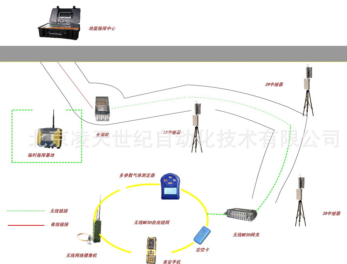 它不需要依賴(lài)管道等介質(zhì),不同與泄露通信,特別適合于搶險(xiǎn)救災(zāi),與國(guó)內(nèi)外同類(lèi)產(chǎn)品相比。該裝置輕巧便攜,能在隧道、地下建筑和復(fù)雜建筑群的地方無(wú)線(xiàn)傳送語(yǔ)音和災(zāi)區(qū)環(huán)境信息。無(wú)線(xiàn)發(fā)射器及攝像頭,由救護(hù)隊(duì)員隨身攜帶,它可以實(shí)時(shí)地將現(xiàn)場(chǎng)的音視頻信息傳輸?shù)交?,基站再將信?hào)傳到地面指揮中心。井下災(zāi)區(qū)的救護(hù)隊(duì)員、井下救援基地和地面指揮中心之間可進(jìn)行實(shí)時(shí)信息溝通,救援全過(guò)程的圖像、語(yǔ)音資料可完整儲(chǔ)存并回放,為今后進(jìn)行事故原因分析、總結(jié)搶險(xiǎn)救災(zāi)經(jīng)驗(yàn)教訓(xùn)提供基礎(chǔ)資料。若同時(shí)連接互聯(lián)網(wǎng),救援指揮中心及指導(dǎo)專(zhuān)家可實(shí)時(shí)了解災(zāi)區(qū)救援情況。